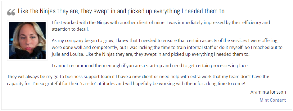 This testimonial is one Blue Ninja received last month from our supplier after 3 months of support. We had time to work with Minite, get to know them and make sure they were delivering, and we were happy to sign off the provided testimonial with a slight revision. It was to the point of our experience, was truthful and put them in a positive light without being boastful. We provided a photo taken with our high-flyer Dheeraj at an event so the picture was also relative to the experience. The sentence we removed from the testimonial we believed did not add or reflect who we are – there was no issue and it does not appear in the final testimonial published.