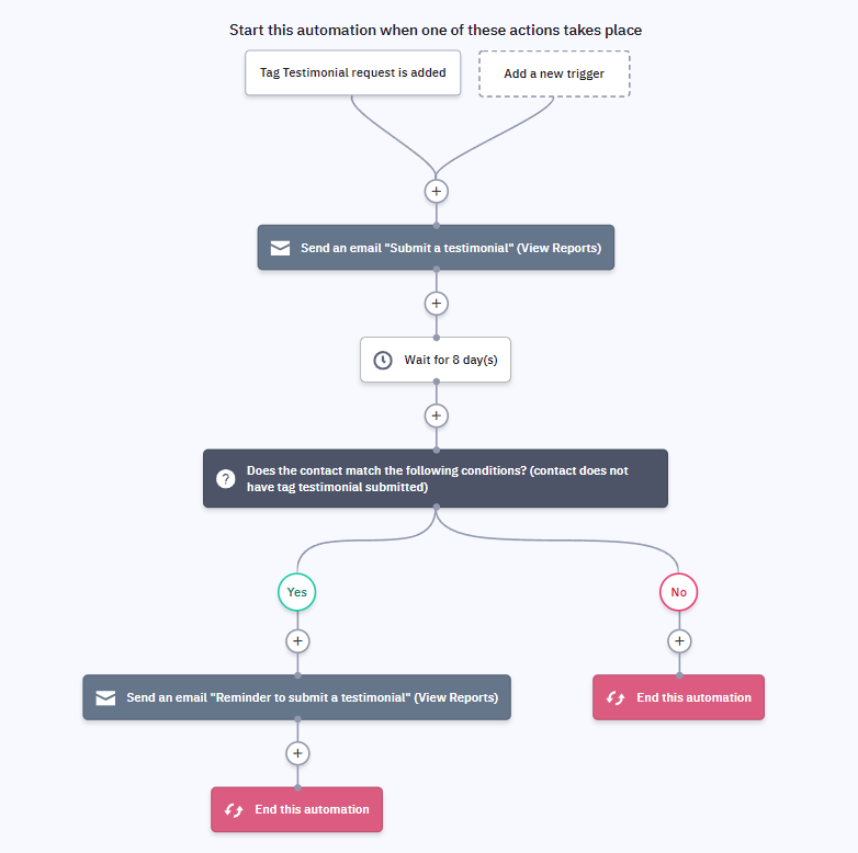 The automation displayed below is developed using Active Campaign and the trigger is Tag Testimonial request is added to a user record.