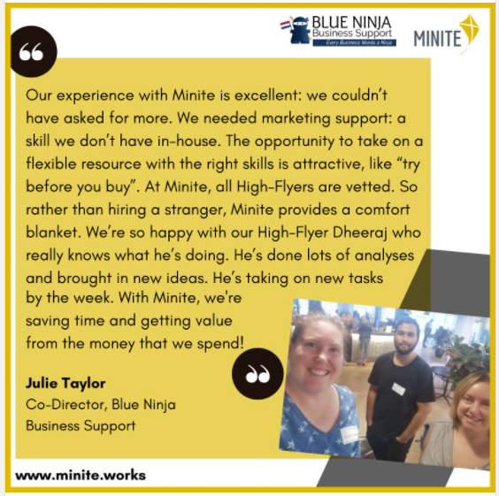 Our experience with Minite is excellent: we couldn’t have asked for more. We needed marketing support: a skill we don’t have in-house. The opportunity to take on a flexible resource with the right skills is attractive, like “try before you buy”. People can write great CVs and profiles but actually not be capable. At Minite, all High-Flyers are vetted. So rather than hiring a stranger, Minite provides a comfort blanket. We’re so happy with our High-Flyer Dheeraj who really knows what he’s doing. He’s done lots of analyses and brought in new ideas. He’s taking on new tasks by the week. I’ll never go back to an intern anymore. With Minite, we’re saving time and getting value from the money that we spend!