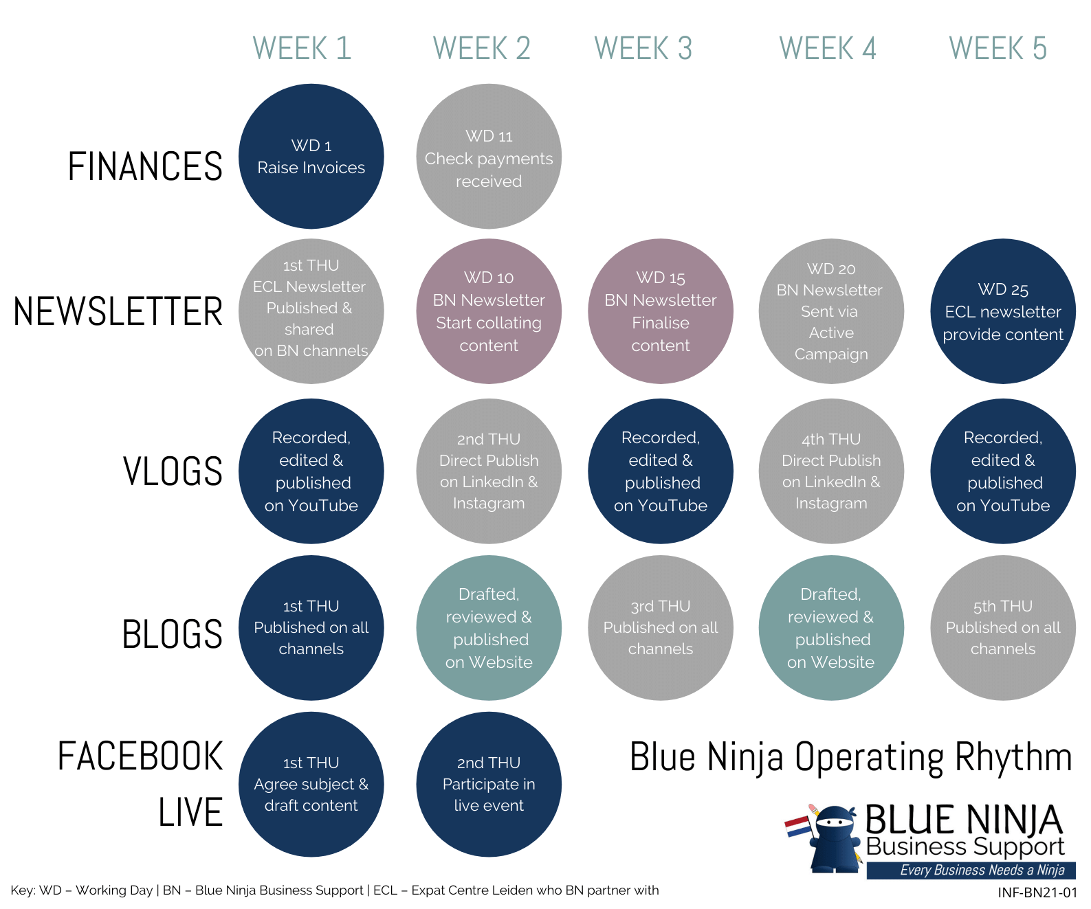 It’s always clearer to see the drains on your time when they’re all written down, even better when they’re in a one-page picture. Why not create your own operating rhythm plan using Blue Ninja’s above.